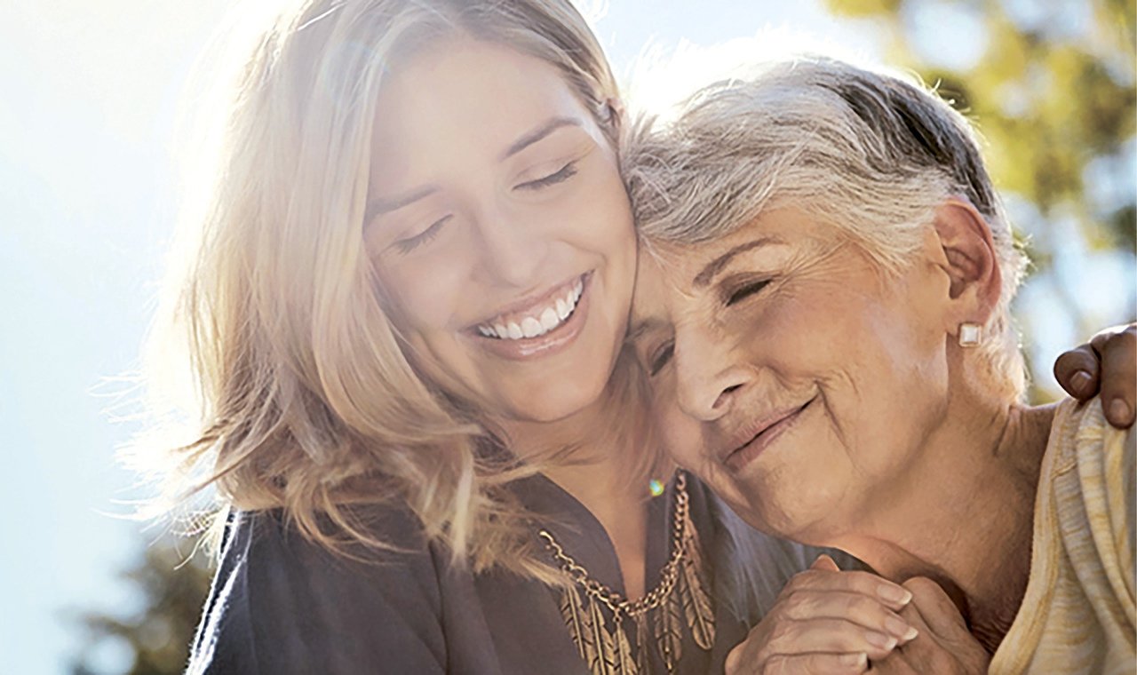 Взрослая дочь обнимает маму