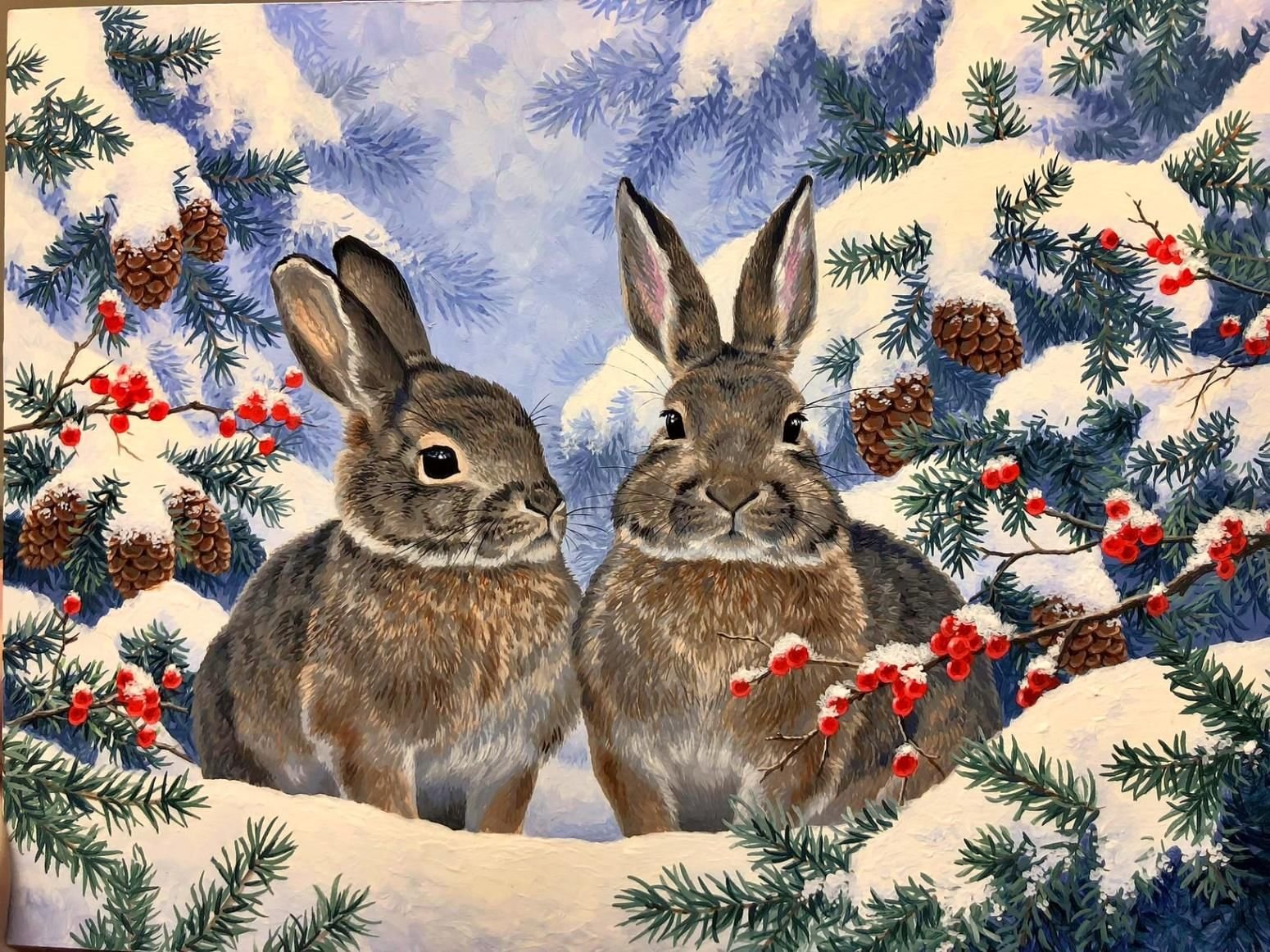 Картинка зайцы в зимнем лесу