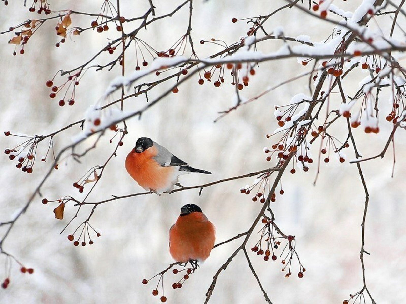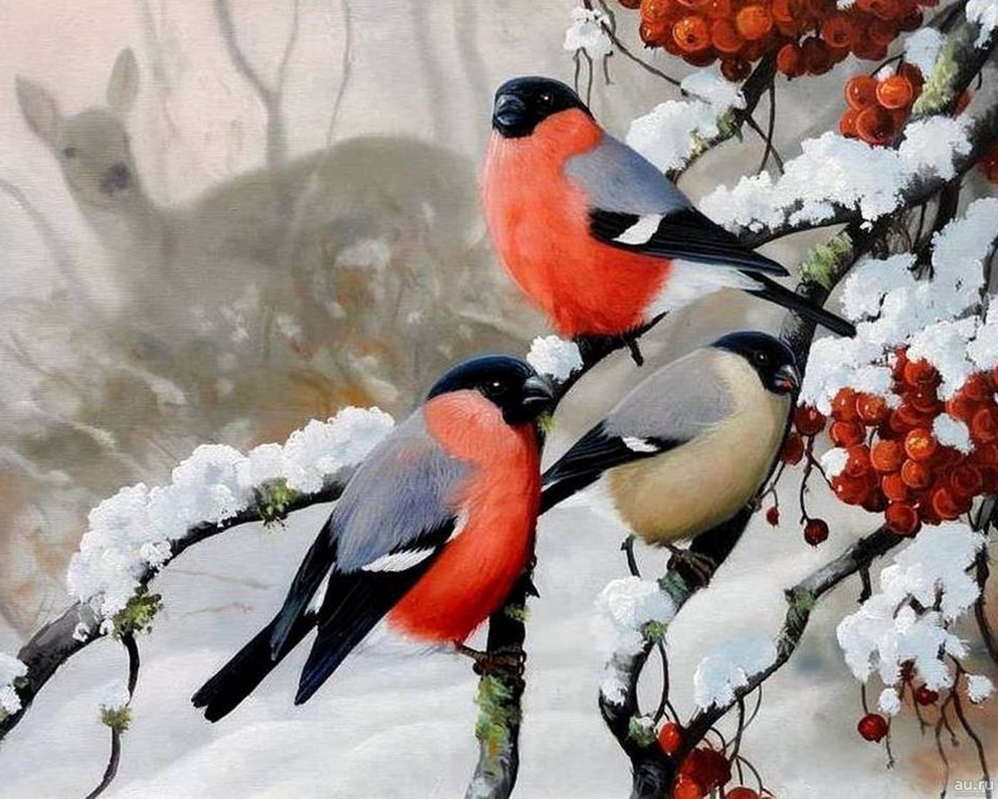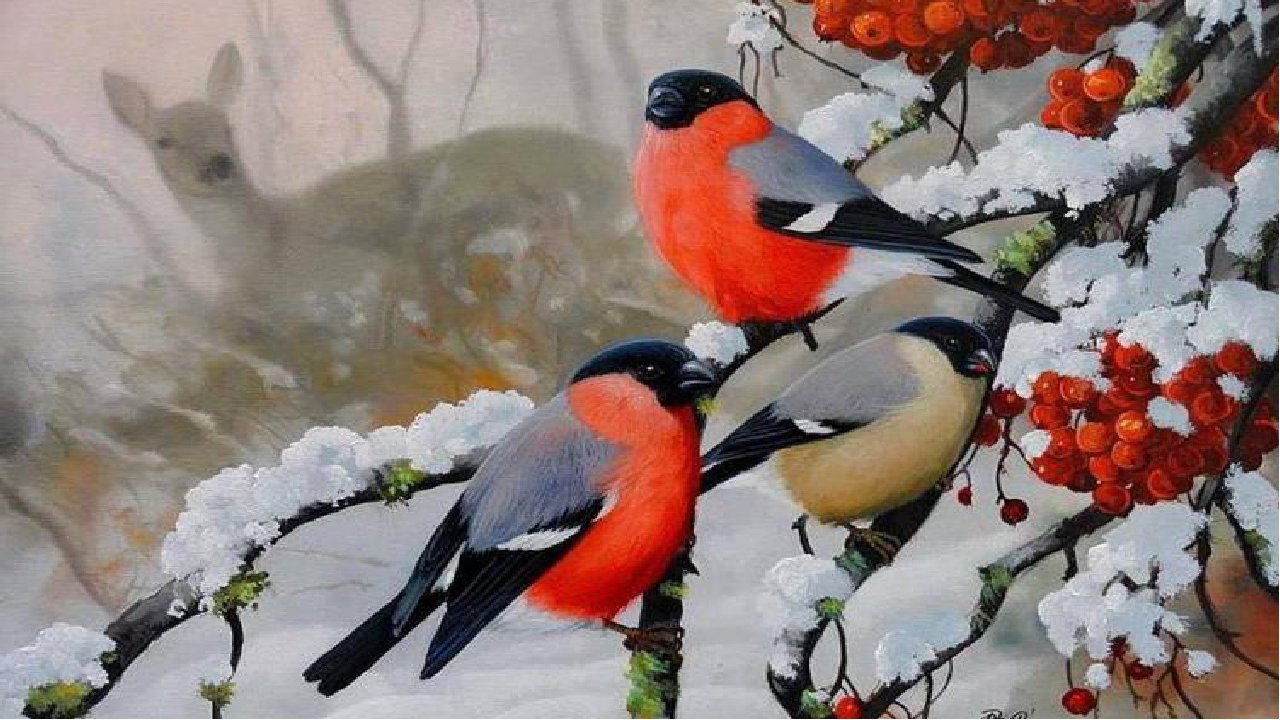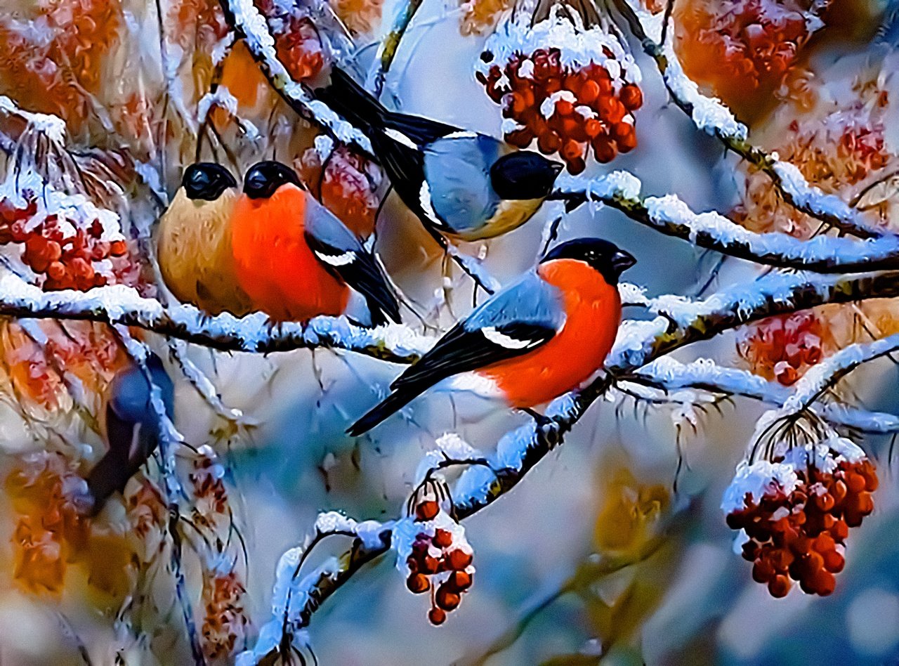 Снегири на рябине зимой