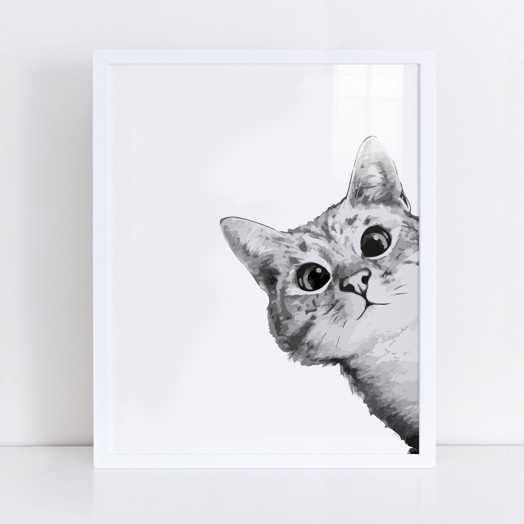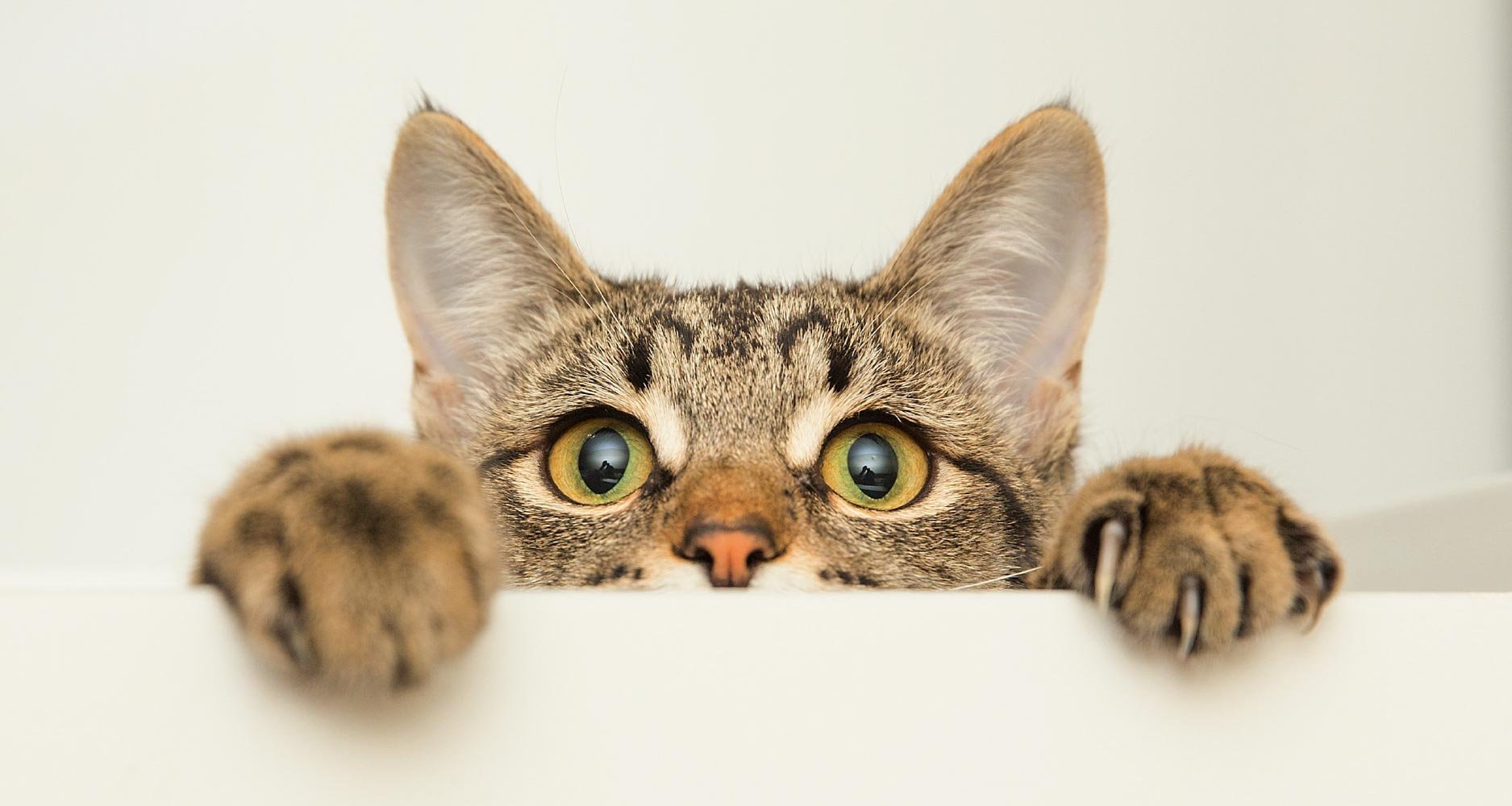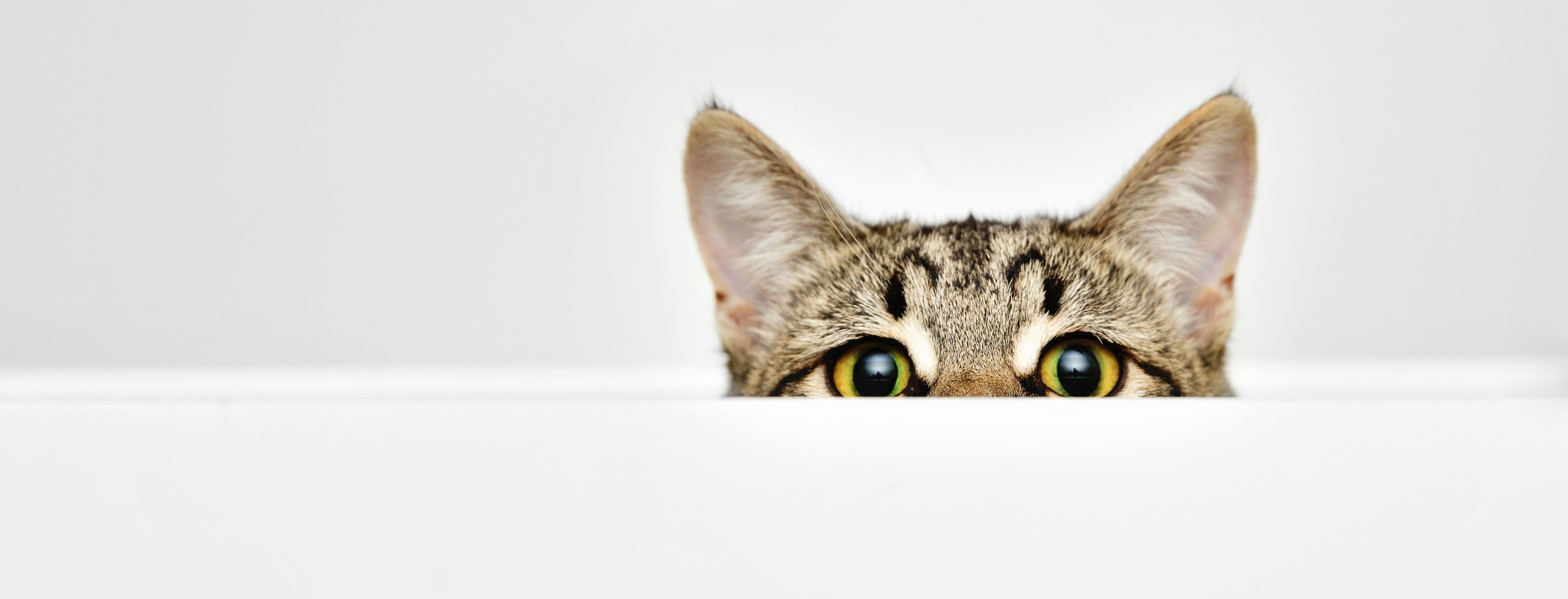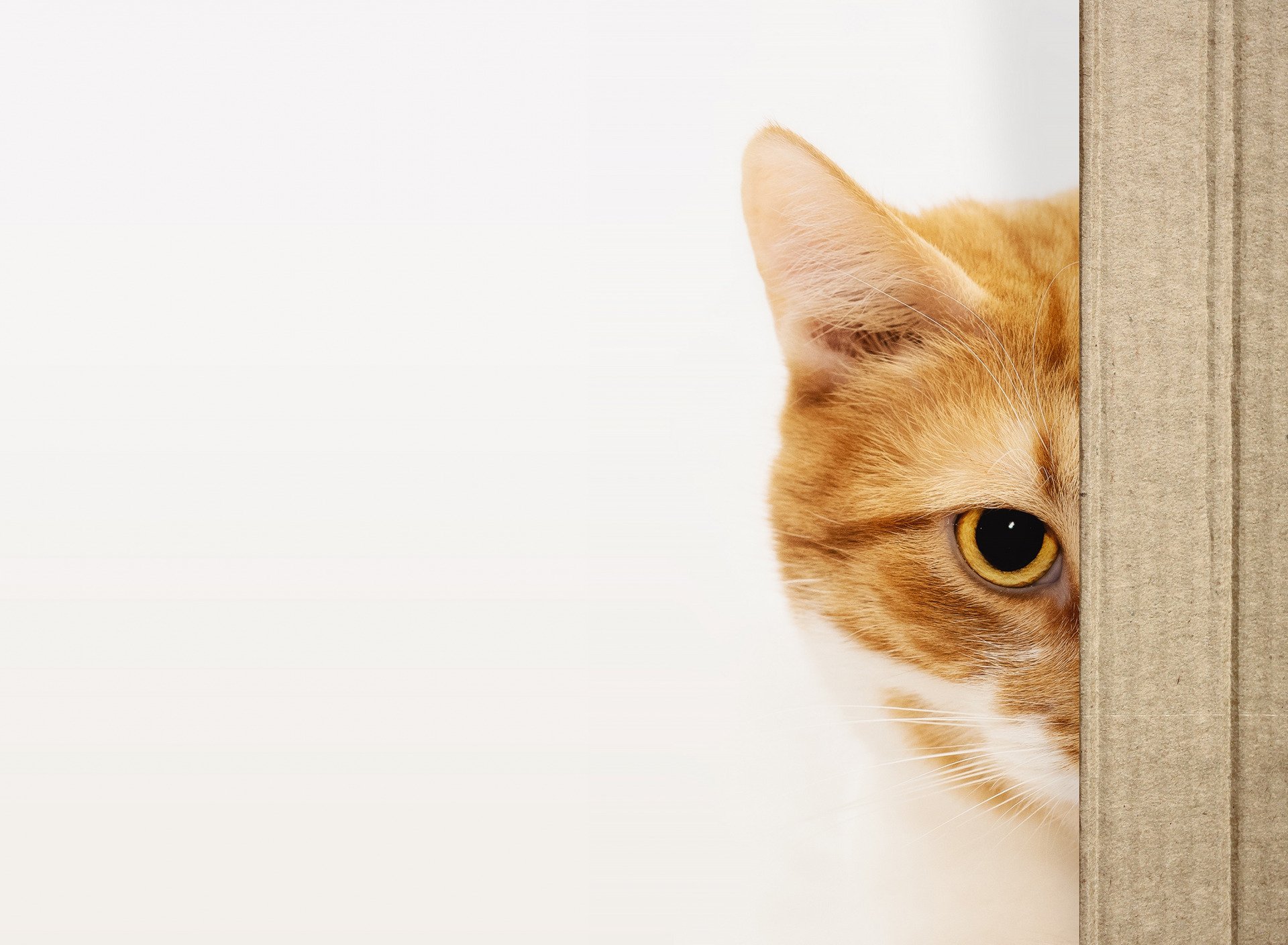 Кот выглядывает из-за угла на белом фоне