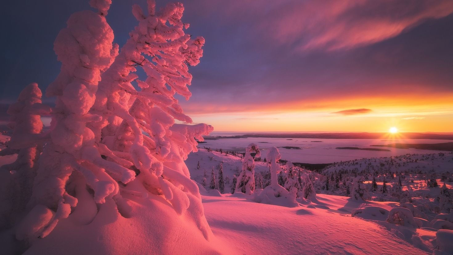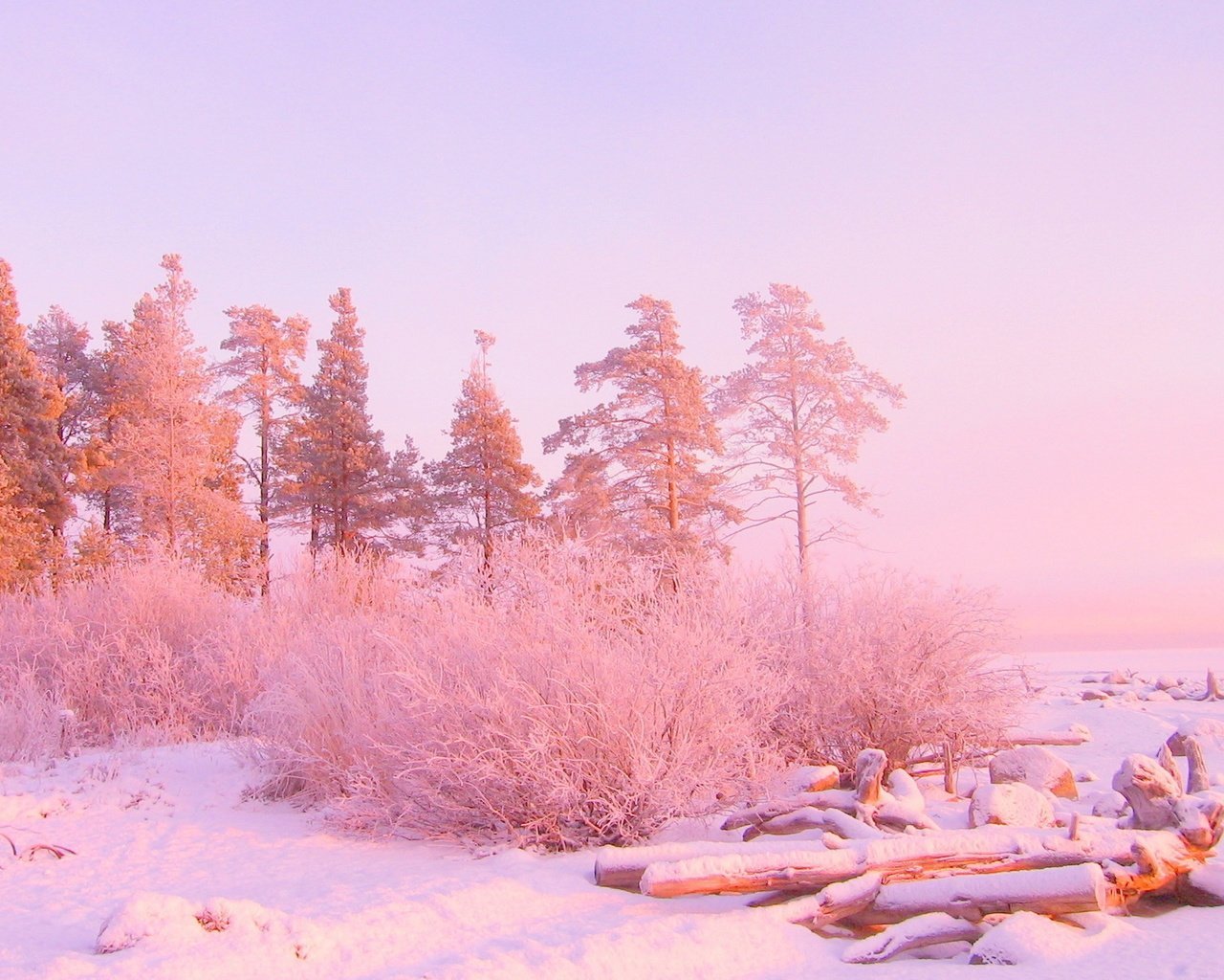 Фото: Деревья в снегу на закате