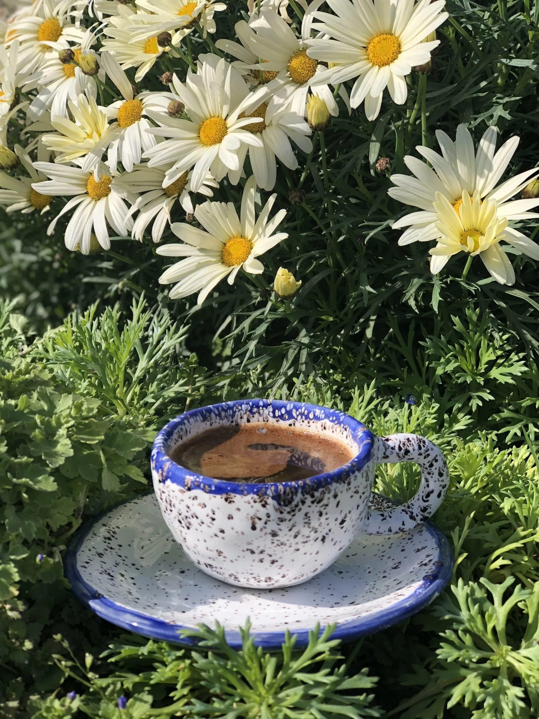 Чашка кофе и ромашки
